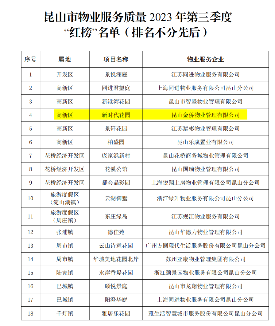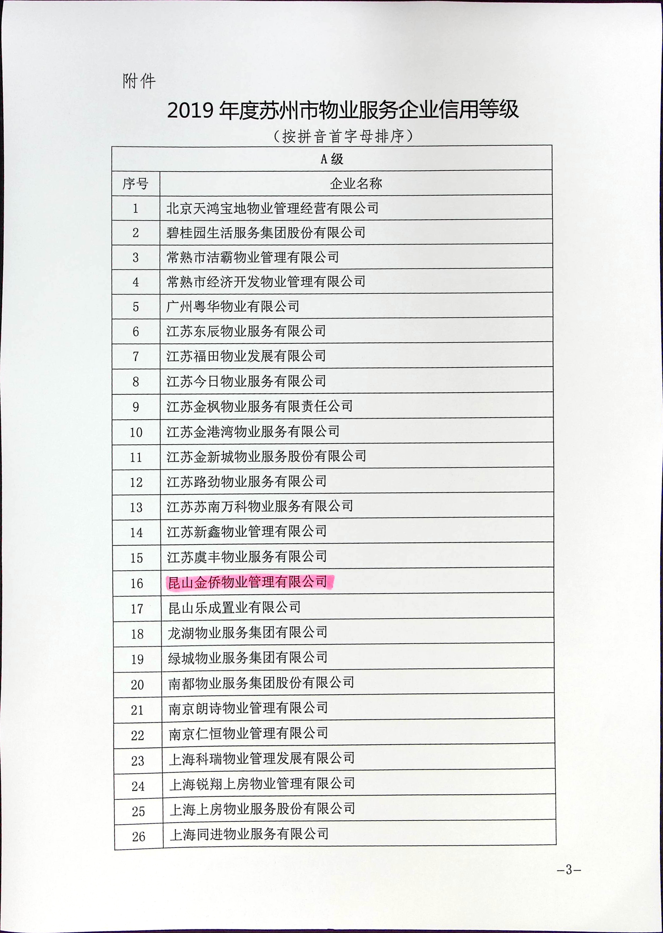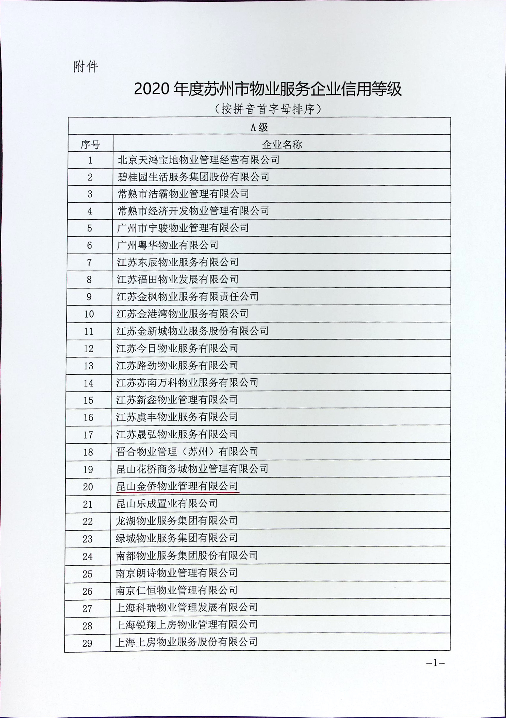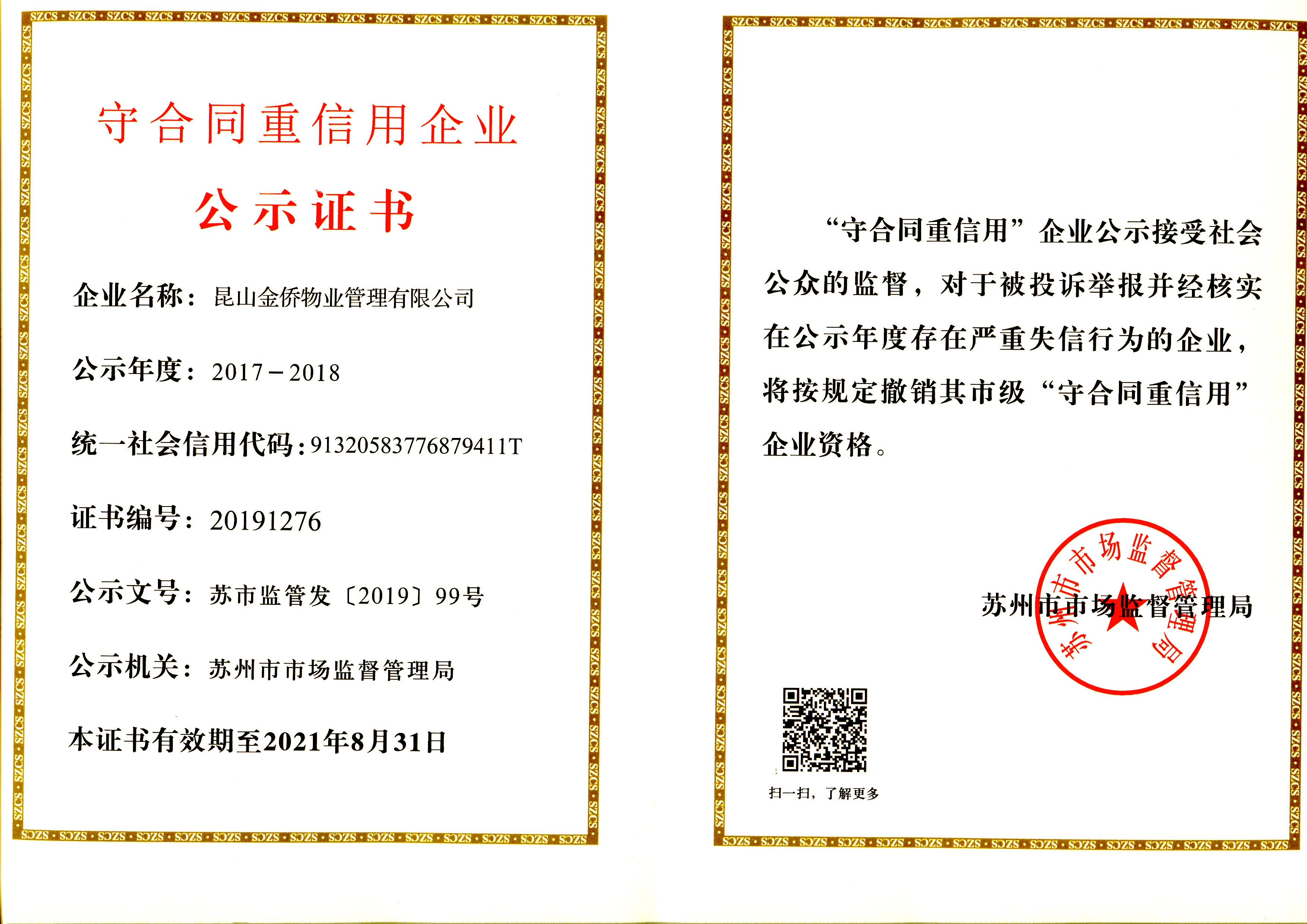昆山金侨物业管理有限公司,公司成立于2005年7月,注册资金2000万元,为昆山市物业管理协会副会长单位、昆山市物业管理甲级信誉单位。公司专业从事中高档居住小区、高档别墅及办公大楼等物业管理,公司自成立之初就一直秉持“诚实守信、服务至上”的管理理念,以“实施科学管理,持续改进服务,不断开拓创新,增强顾客满意”为质量方针,为业主和客户提供一流的高品质服务,其中多个小区获得了苏州市、昆山市物业管理优秀项目。